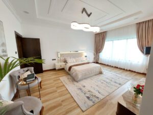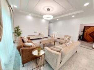 This exceptional residence features elegant interiors with a spacious lounge opening to a balcony offering picturesque garden and pool views, a dedicated dining area, and a guest cloakroom. The gourmet open-plan kitchen is fitted with a pantry, cooker, oven, hood, and microwave, plus a separate practical dirty kitchen. All four spacious bedrooms boast ensuite bathrooms, inbuilt wardrobes, and wooden floors, with the master suite featuring a private balcony overlooking greenery. Practical touches include an enclosed laundry area and naturally well-lit rooms.